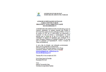 O Estado do Piauí, através da Secretária da Agricultura Familiar/SAF torna publico aos interessados, a suspensão da data de abertura e credenciamento da sessão marcada para as 09:00 hs do dia 04/11/2020,cujo objeto é: contratação de empresa de engenharia para construção de 01 (uma) Passagem Molhada na Localidade Fortaleza VII, na zona rural do município de Esperantina-PI. A nova data da licitação será informada posteriormente através de nova publicação, na forma da lei.