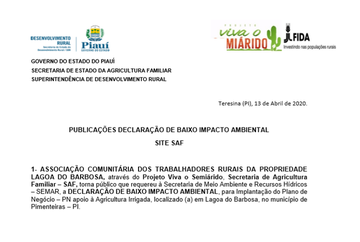 A Secretária de Estado da Agricultura Familiar, torna público que requereu à Secretaria de Meio Ambiente e Recursos Hídricos – SEMAR, a DECLARAÇÃO DE BAIXO IMPACTO AMBIENTAL, para Implantação do Plano de Negócio de cadeias produtivas em alguns municípios do Piauí.